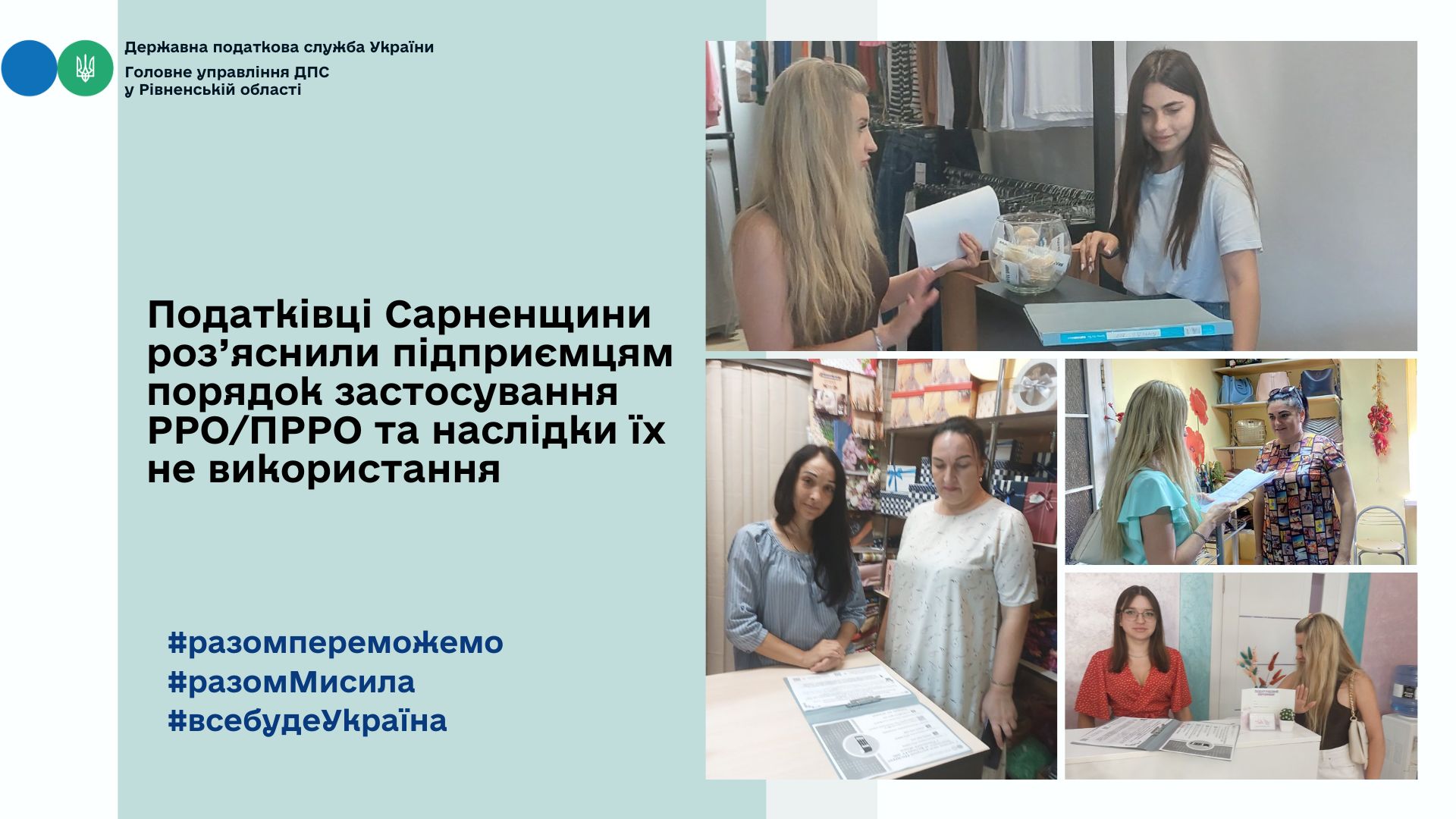 Фахівці податкової служби Сарненської ДПІ ГУ ДПС у Рівненській області області провели чергові зустрічі з приватними підприємцями та працівниками, які проводять торгівельну діяльність в місцевих закладах торгівлі. Основною метою таких зустрічей було інформування щодо застосування реєстраторів розрахункових операцій та програмних РРО, а також наслідків їх не використання.
