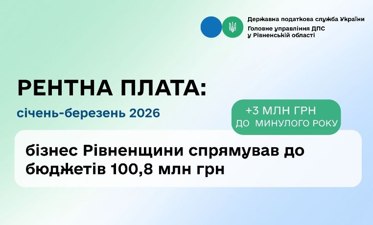 У січні – березні 2026 року суб’єкти господарювання Рівненщини перерахували до бюджетів усіх рівнів 100,8 млн грн рентної плати. Це на 3,0 млн грн більше, ніж за аналогічний період минулого року, повідомили у Головному управлінніДПС у Рівненській області.