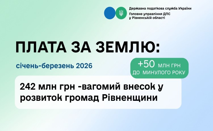 Упродовж січня–березня 2026 року до місцевих бюджетів Рівненської області надійшло 242 млн грн плати за землю. Порівняно з аналогічним періодом минулого року надходження зросли на 26%, що забезпечило додаткові 50 млн гривень для розвитку територіальних громад.