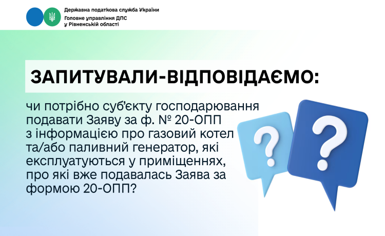 Таким чином, суб’єкту господарювання повідомляти контролюючий орган за основним місцем обліку шляхом подачі Заяви за ф. 20-ОПП про газовий котел та/або паливний генератор, які експлуатуються за адресами розташування власних або орендованих приміщень юридичної особи, стосовно яких подавалася Заява за ф. 20-ОПП, не потрібно.