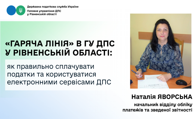 У Головному управлінні ДПС у Рівненській області відбулася «гаряча лінія», присвячена питанням обліку платежів, використання єдиного рахунку, заповнення платіжних інструкцій та можливостям Електронного кабінету. На запитання платників відповідала начальник відділу обліку платежів та зведеної звітності Наталія Яворська.