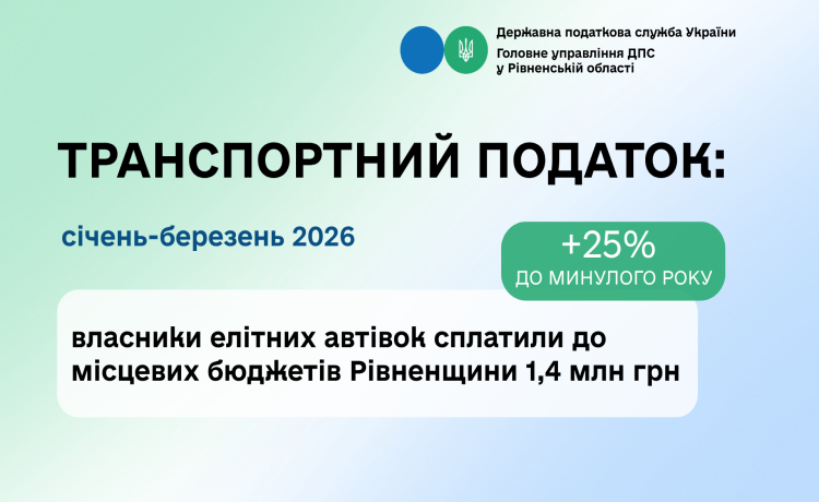 Упродовж січня – березня 2026 року власники елітних автівок сплатили до місцевих бюджетів Рівненщини 1 млн 370 тис грн транспортного податку. Це на 25% більше, ніж за аналогічний період минулого року. У грошовому еквіваленті надходження збільшились на 277 тис гривень.