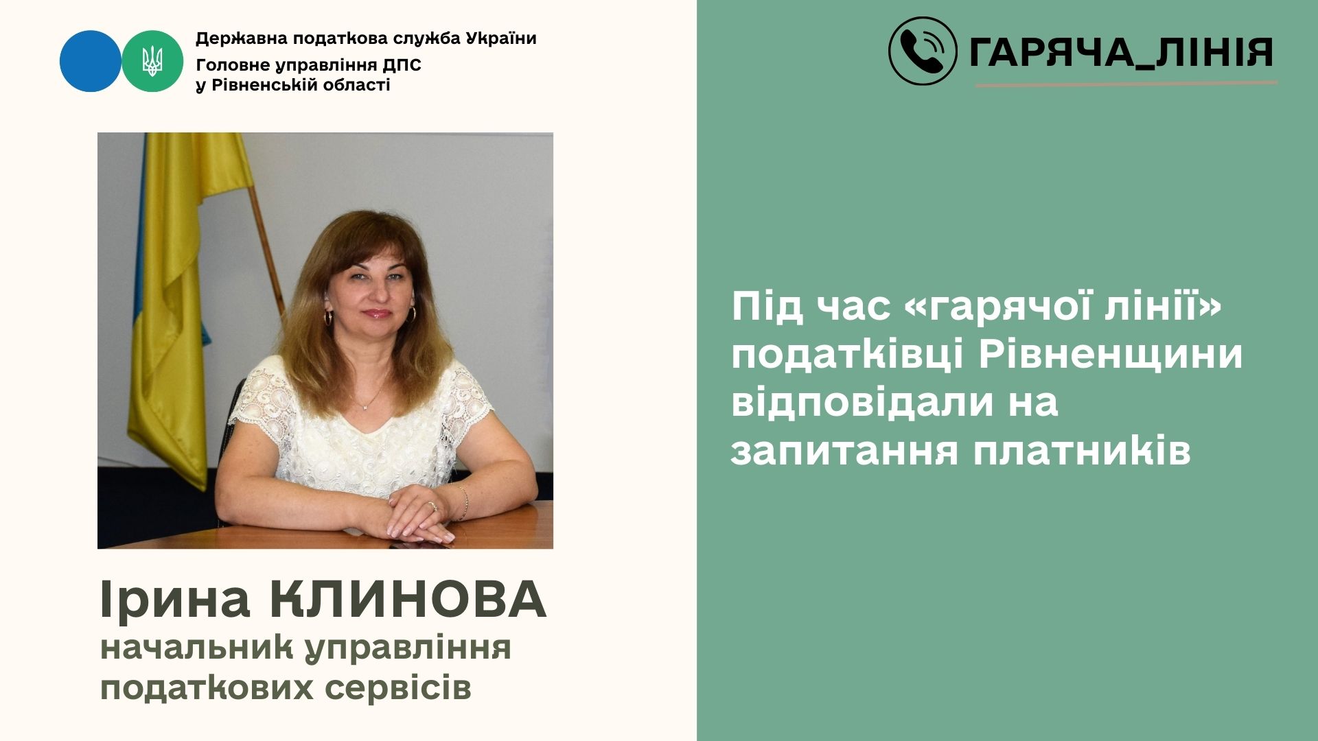 У Головному управлінні ДПС у Рівненській області проведено «гарячу лінію» на тему використання сучасних електронних сервісів ДПС – Електронного кабінету платника та мобільного застосунку «Моя податкова». На запитання платників податків відповідала начальник управління податкових сервісів Ірина Клинова.