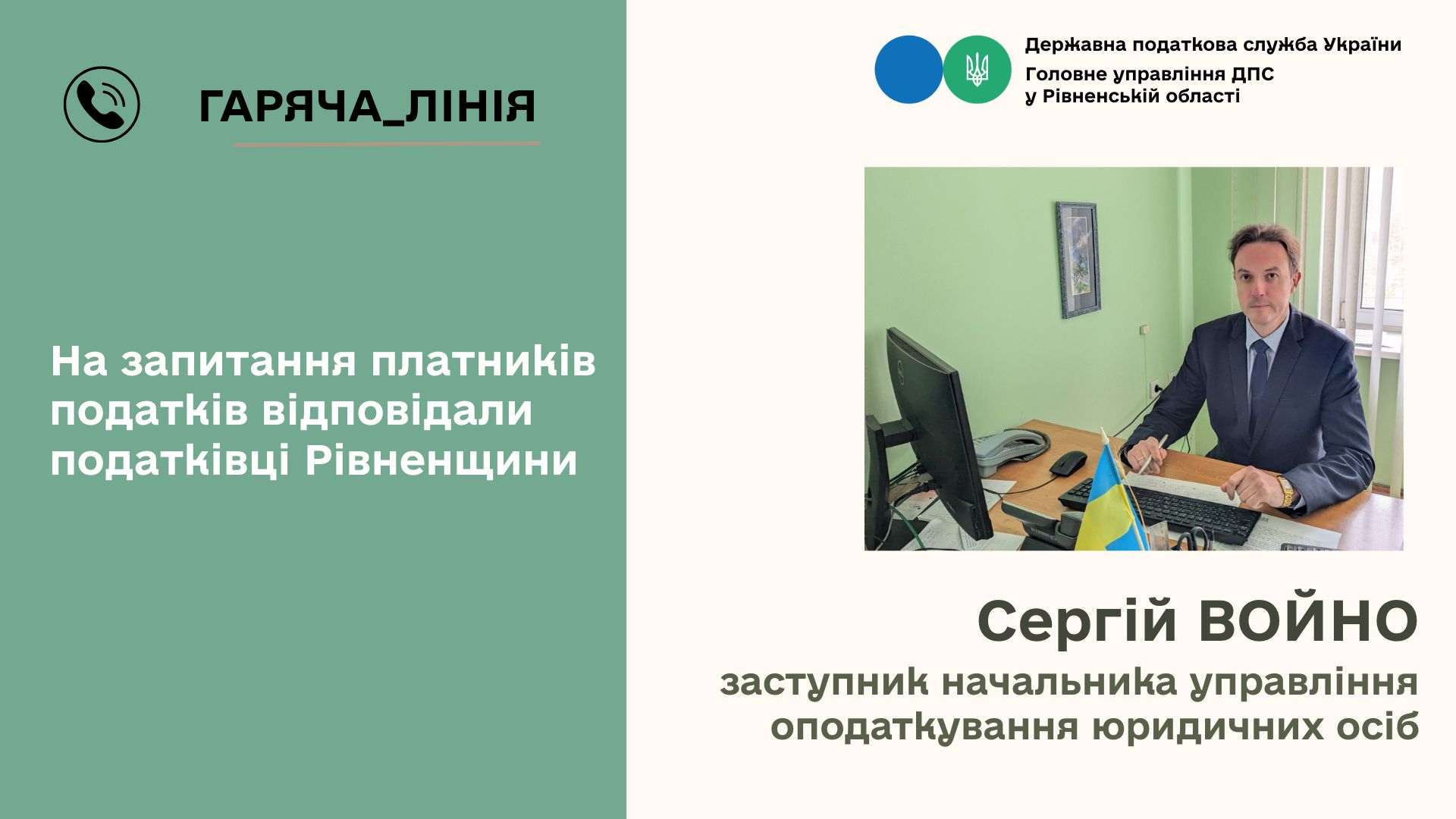 У Головному управлінні ДПС у Рівненській області відбулася «гаряча лінія» для платників податків, присвячена актуальним питанням адміністрування податку на додану вартість. На дзвінки представників бізнесу відповідав заступник начальника управління оподаткування юридичних осіб – начальник відділу адміністрування ПДВ Сергій Войно.