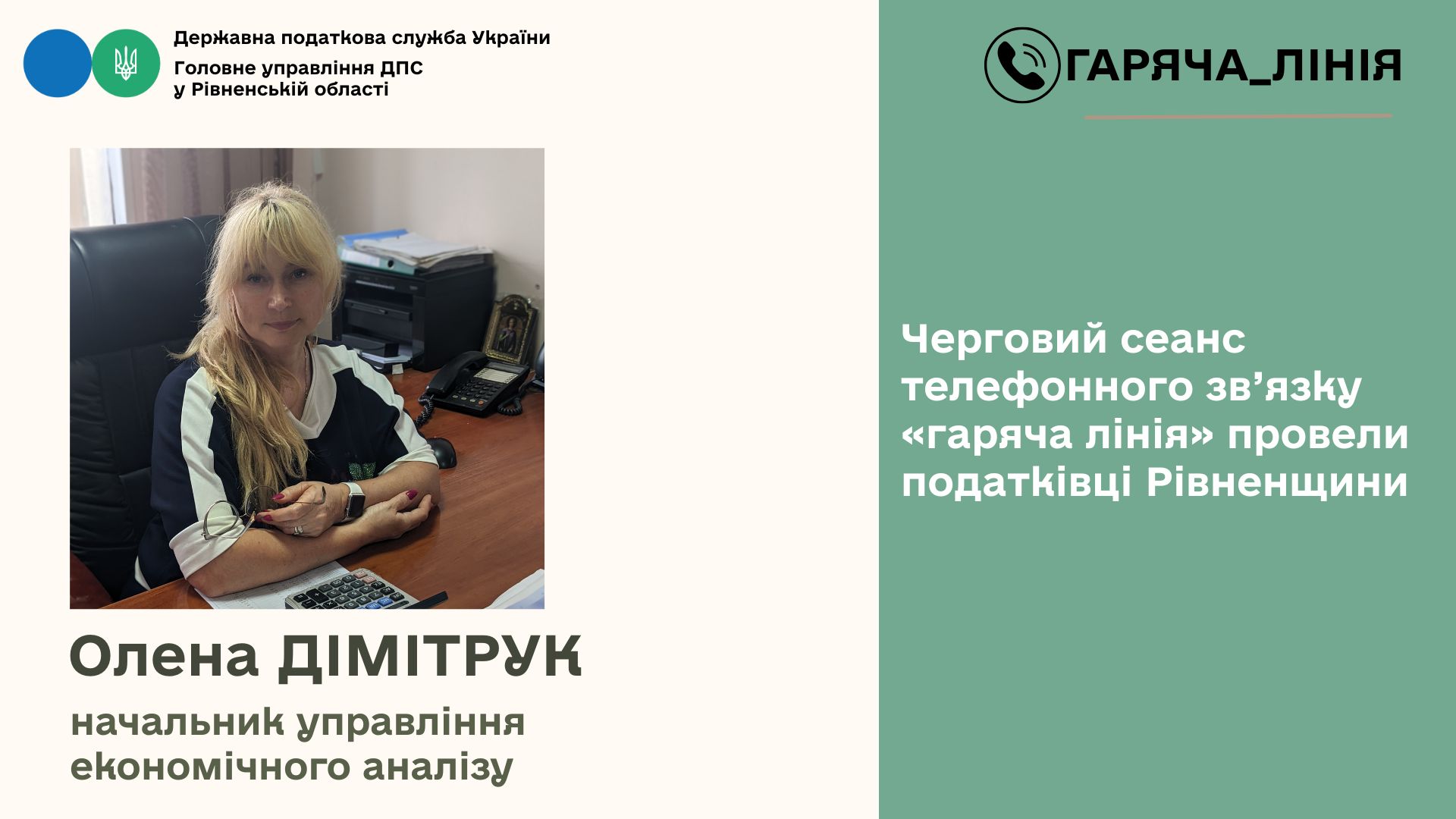 У Головному управлінні ДПС у Рівненській області проведено «гарячу лінію» на тему «Основні аспекти Національної стратегії доходів до 2030 року. Реалізація експериментального проєкту щодо функціонування системи управління податковими ризиками (комплаєнс-ризиками) в Державній податковій службі України». На запитання платників податків відповідала начальник управління економічного аналізу Олена Дімітрук.