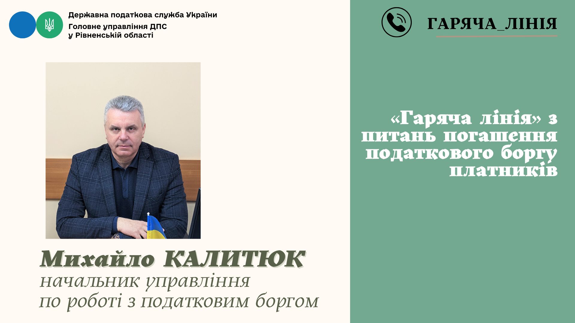 У Головному управлінні ДПС у Рівненській області проведено телефонну «гарячу лінію» на тему: «Погашення податкового боргу платників, необхідність своєчасної сплати податків та єдиного внеску, наслідки у разі їх несплати». На запитання платників податків відповідав начальник управління по роботі з податковим боргом Михайло Калитюк.