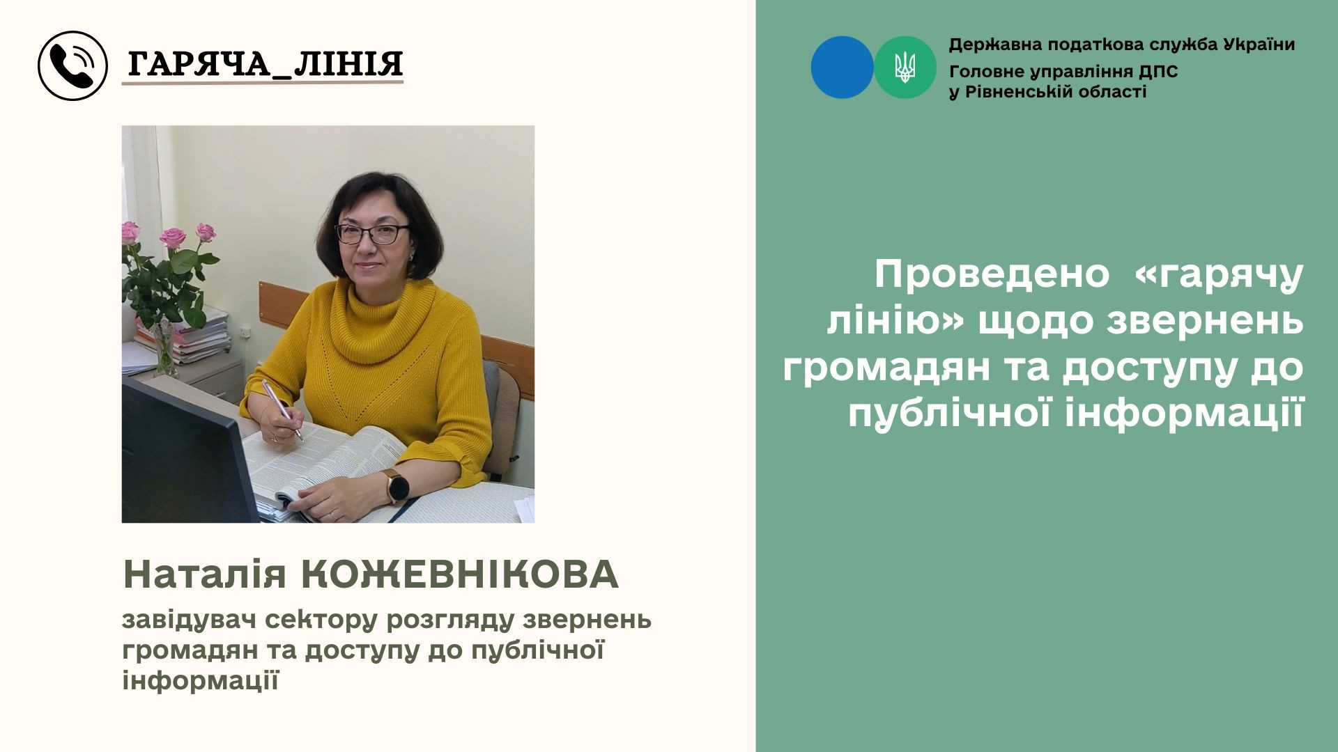 У Головному управлінні ДПС у Рівненській області проведено чергову «гарячу лінію» на тему «Звернення громадян та порядок доступу до публічної інформації». Метою заходу було підвищення рівня поінформованості мешканців області щодо їхніх прав на подання звернень, отримання офіційної інформації та особливостей електронної комунікації з податковими органами.