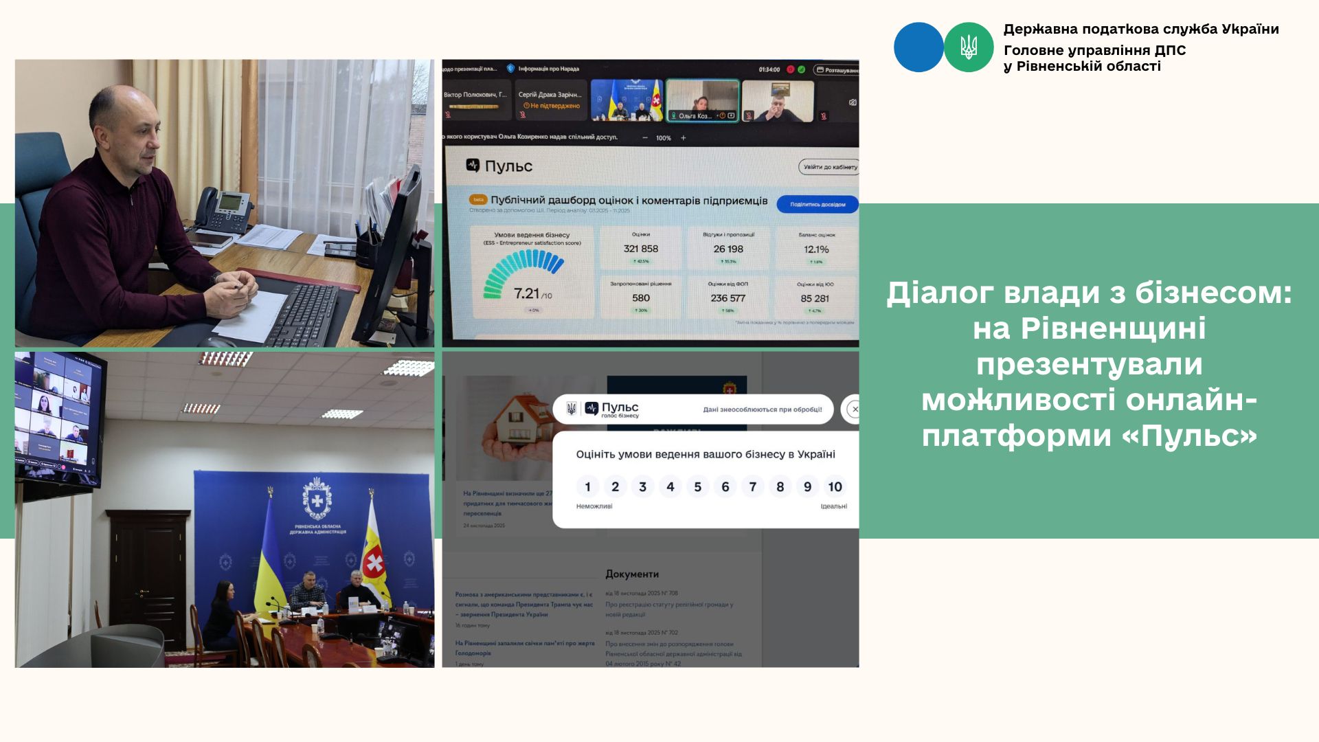 У Рівненській області відбулася чергова онлайн-зустріч у рамках формату «Діалог влади з бізнесом», у якій взяли участь понад 100 підприємців регіону. Подію присвячено обговоренню пілотного проєкту з упровадження нової електронної платформи «Пульс» — інструменту, що формує прозорий канал комунікації між підприємцями та державою.