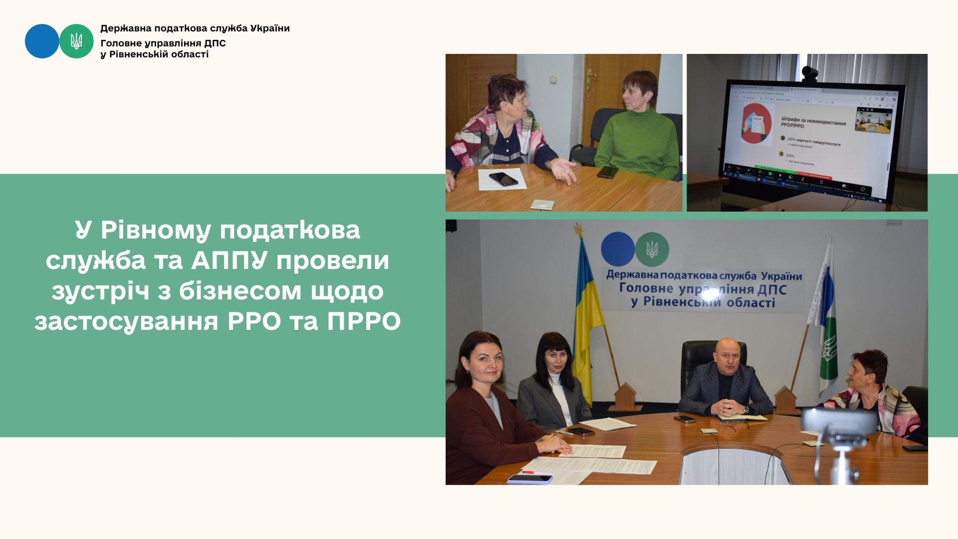 Головне управління ДПС у Рівненській області спільно з Територіальним відділенням Асоціації платників податків України провели робочу зустріч з представниками бізнесу області. Під час заходу учасники обговорили актуальні питання застосування реєстраторів розрахункових операцій (РРО) та програмних РРО у сфері торгівлі, громадського харчування та надання послуг.