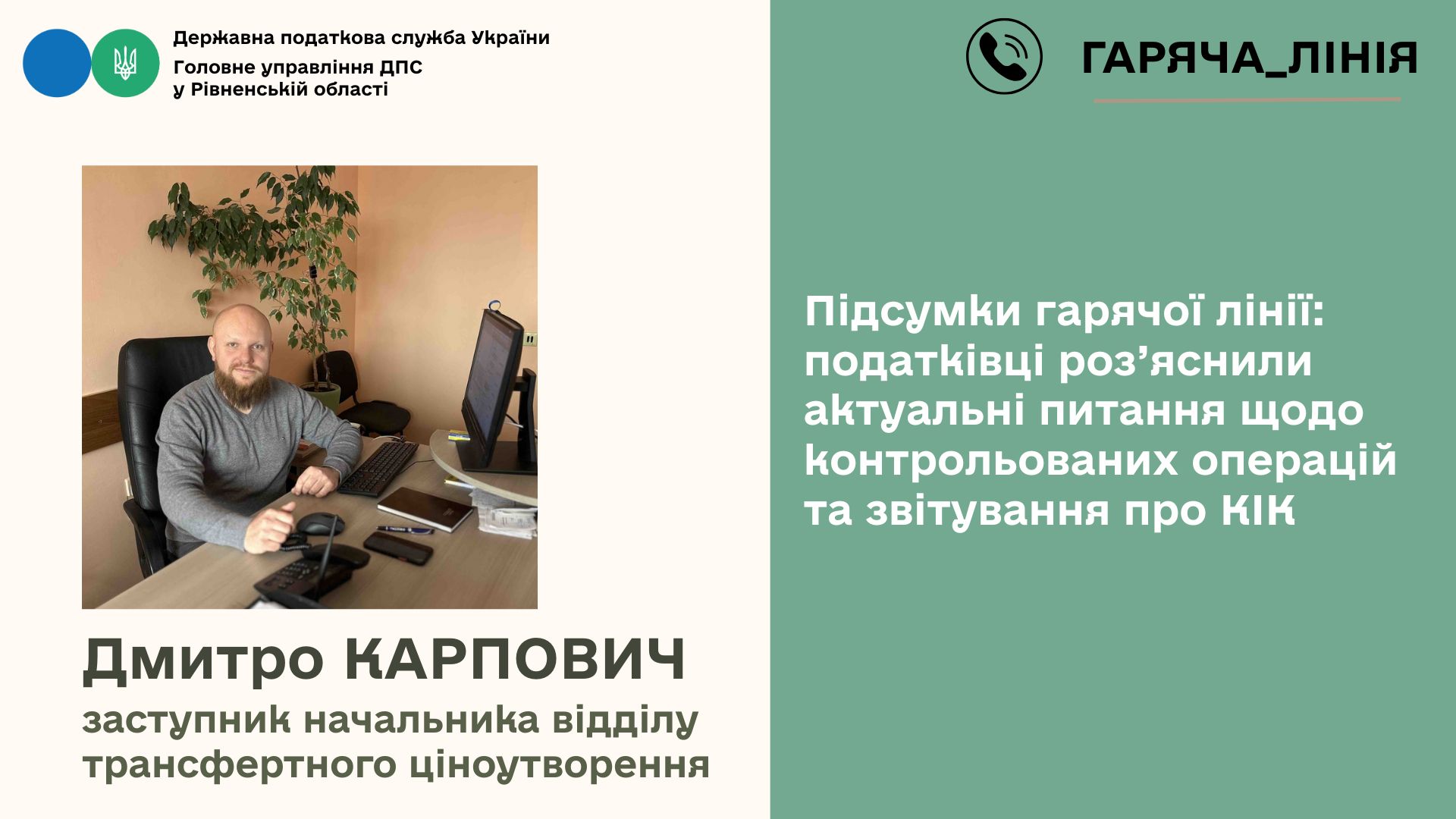 У Головному управлінні ДПС у Рівненській області проведено «гарячу лінію», присвячену актуальним питанням податкового законодавства у сфері контрольованих операцій та звітування про контрольовані іноземні компанії (КІК).