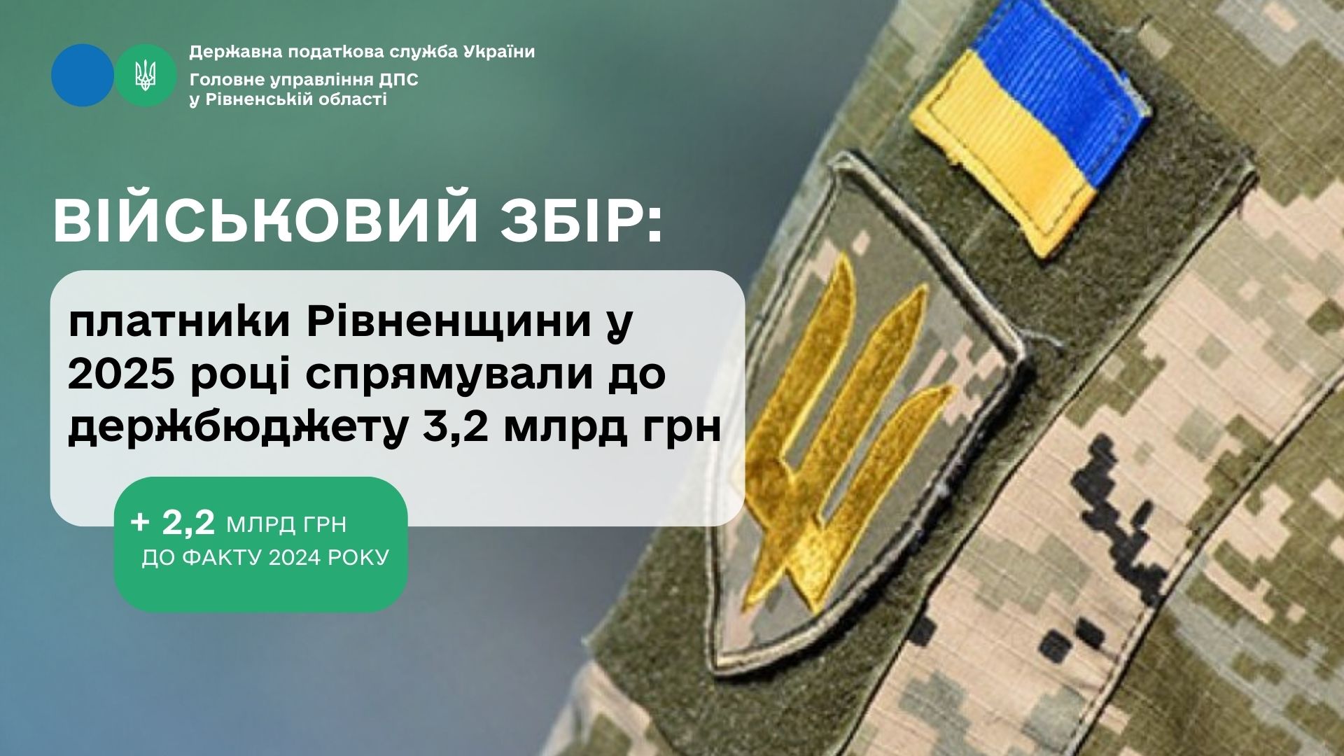 За січень–грудень 2025 року платники податків Рівненської області перерахували до державного бюджету 3,2 млрд гривень військового збору. Це на 2,2 млрд грн більше, ніж за за 2024 рік.