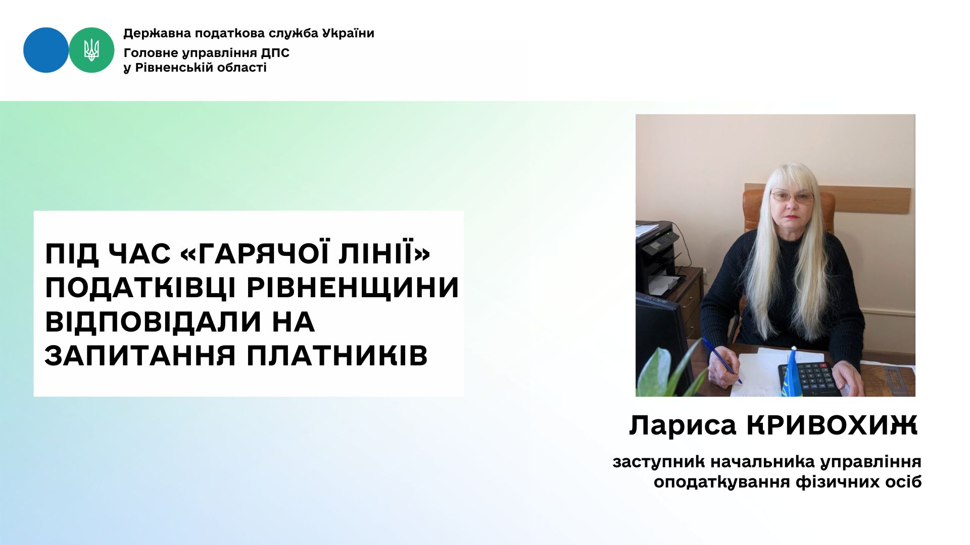 У Головному управлінні ДПС у Рівненській області відбулася «гаряча лінія» з актуальних питань оподаткування та декларування доходів громадян і фізичних осіб – підприємців. На запитання додзвонювачів відповідала заступник начальника управління оподаткування фізичних осіб Лариса Кривохиж.