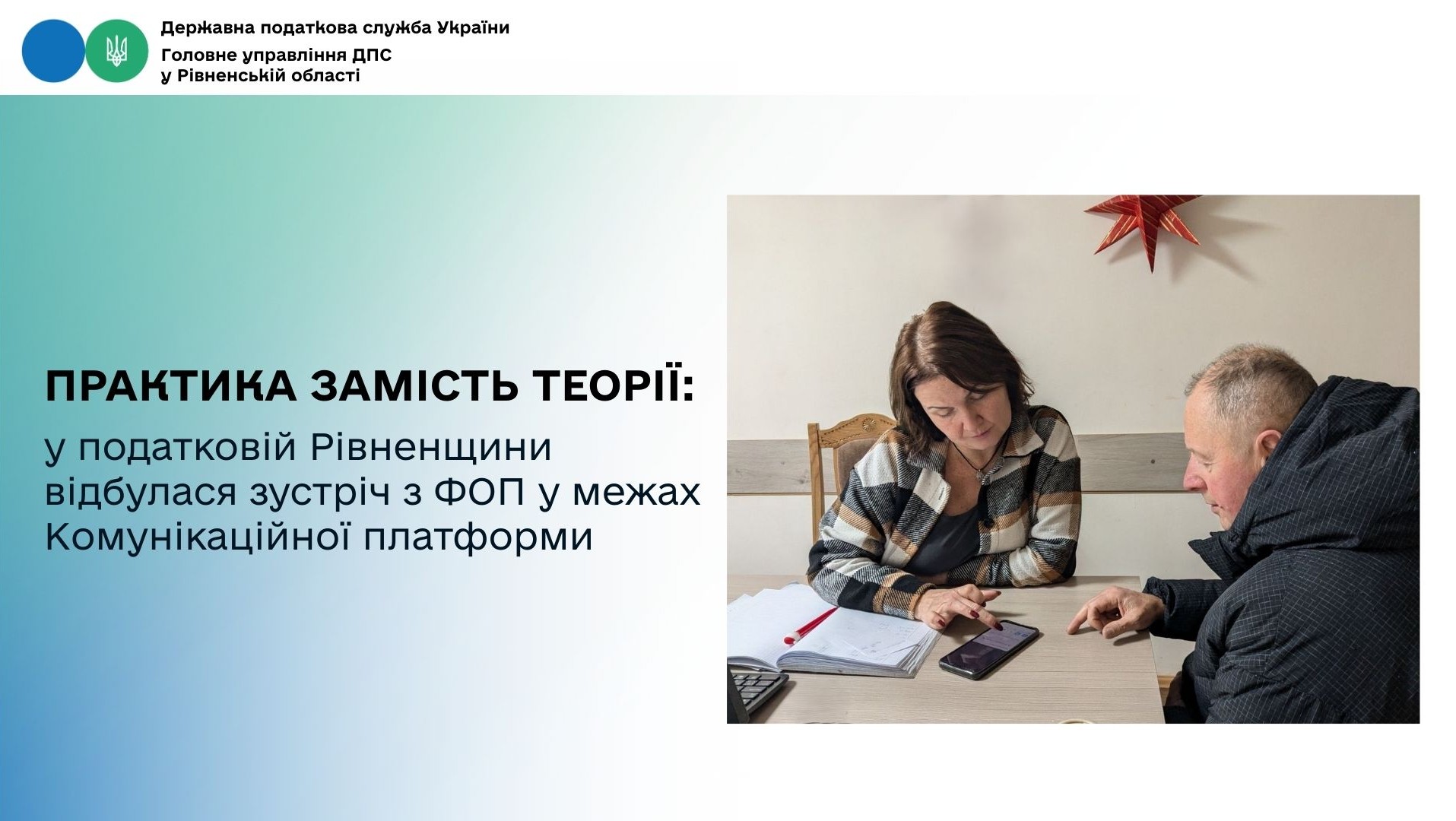 У Головному управлінні ДПС у Рівненській області в межах діяльності Комунікаційної платформи відбулася робоча зустріч із фізичними особами – підприємцями. Захід був спрямований на практичну допомогу бізнесу у впровадженні та використанні програмного реєстратора розрахункових операцій (ПРРО).