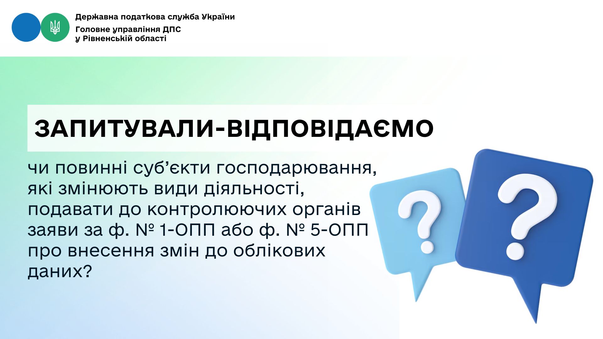 Запитували-відповідаємо: чи повинні суб’єкти господарювання, які змінюють види діяльності, подавати до контролюючих органів заяви за ф. № 1-ОПП або ф. № 5-ОПП про внесення змін до облікових даних?
