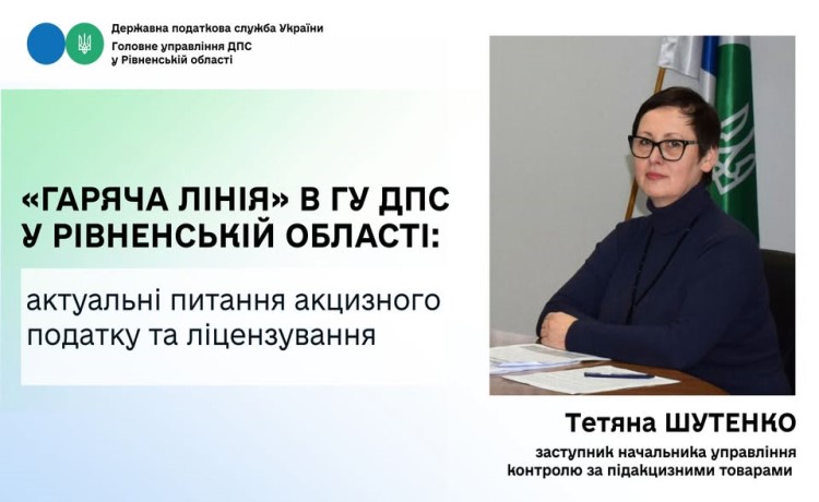 У Головному управлінні ДПС у Рівненській області відбулася «гаряча лінія», присвячена новаціям законодавства та актуальним питанням сплати акцизного податку, ліцензування, а також контрольно-перевірочної роботи у сфері виробництва та реалізації підакцизних товарів. На запитання платників податків відповідала заступник начальника управління контролю за підакцизними товарами Тетяна Шутенко.