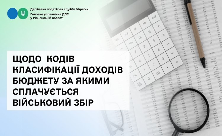У Головному управлінні ДПС у Рівненській області нагадують платникам податків, що відповідно до наказу Міністерства фінансів України від 14.01.2011 № 11 «Про бюджетну класифікацію» із змінами та доповненнями військовий збір сплачується (перераховується) платниками за кодами класифікації доходів бюджету:
