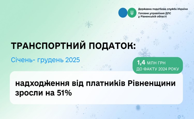 Упродовж 2025 року бюджети територіальних громад Рівненської області отримали 4,3 млн гривень транспортного податку. Це на 51% більше, ніж за підсумками 12 місяців 2024 року, коли сума надходжень становила 2,9 млн гривень.