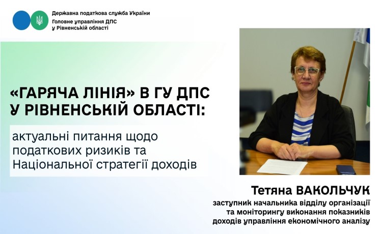 У Головному управлінні ДПС у Рівненській області відбулася «гаряча лінія», присвячена питанням реалізації Національної стратегії доходів до 2030 року та функціонуванню системи управління податковими ризиками (комплаєнс-ризиками) в Державній податковій службі України.