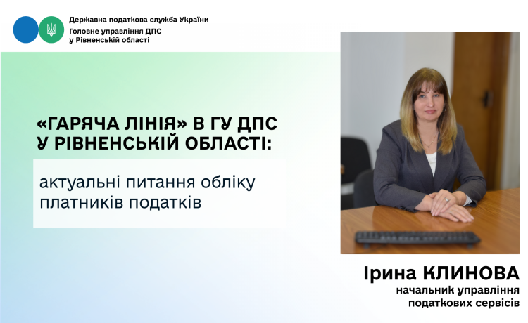 Нещодавно в Головному управлінні ДПС у Рівненській області відбулася тематична «гаряча лінія», присвячена актуальним питанням обліку платників податків. На запитання додзвонювачів відповідала начальник управління податкових сервісів Ірина Клинова.