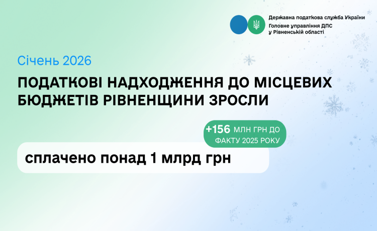 Упродовж січня 2026 року платники податків Рівненської області забезпечили надходження до місцевих бюджетів у сумі 1 млрд 5 млн гривень. Про це повідомив начальник Головного управління ДПС у Рівненській області Сергій Вінніченко. Порівняно з аналогічним періодом 2025 року обсяг надходжень зріс на 156 млн гривень.