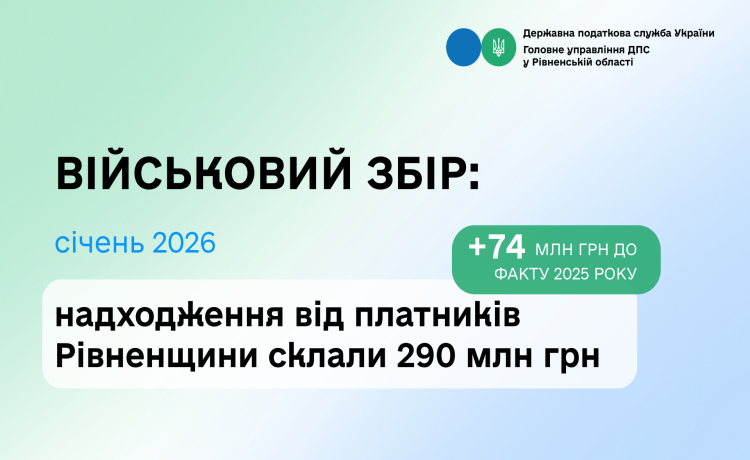 Упродовж січня 2026 року платники податків Рівненської області перерахували до державного бюджету 290 млн гривень військового збору. Це на 74 млн грн більше, ніж за аналогічний період 2025 року, що свідчить про зростання фінансової підтримки оборонних потреб держави.