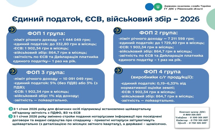 Звертаємо увагу, що для ФОП – платників єдиного податку першої та другої груп у 2026 році розмір мінімального єдиного внеску на загальнообов’язкове державне соціальне страхування становить 1 902,34 грн на місяць, військовий збір — 864,7 грн, а розмір єдиного податку визначається в межах, встановлених для відповідної групи.