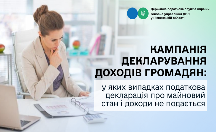 ГУ ДПС у Рівненській області нагадує, що триває кампанія декларування доходів, отриманих громадянами у 2025 році. Відповідно до п. 179.2 ст. 172 Податкового кодексу подання податкової декларації вважається виконаним і податкова декларація не подається, якщо платник податку отримував: