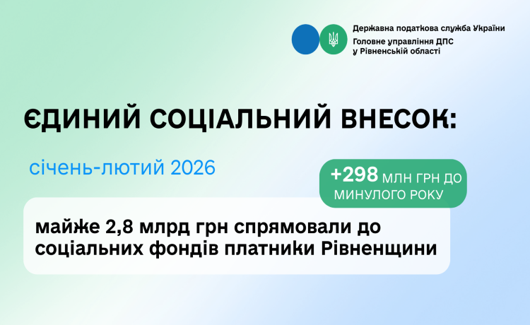 Упродовж двох перших місяців 2026 року платники Рівненщини перерахували 2 млрд 788 млн грн єдиного внеску на загальнообов’язкове державне соціальне страхування (ЄСВ).