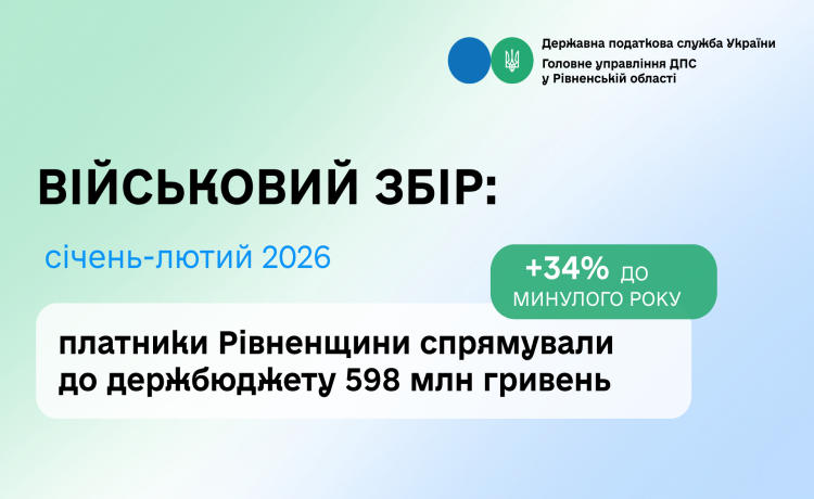 За січень–лютий 2026 року платники податків Рівненщини перерахували до бюджету країни 598 млн грн військового збору, що на 152 млн грн, або на 34% більше, ніж за аналогічний період минулого року.