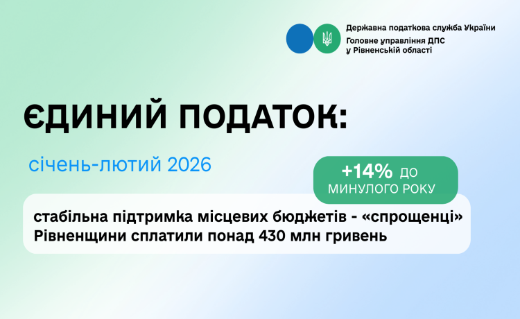 За два перших місяці 2026 року до місцевих бюджетів Рівненської області від суб’єктів господарювання, які працюють на спрощеній системі оподаткування, надійшло понад 430 млн грн єдиного податку.