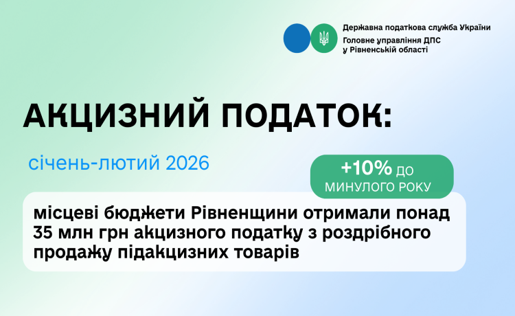 Упродовж січня-лютого 2026 року до бюджетів територіальних громад Рівненщини надійшло 35,4 млн грн акцизного податку з роздрібної торгівлі підакцизними товарами, що на 3,3 млн грн більше надходжень відповідного періоду 2025 року.