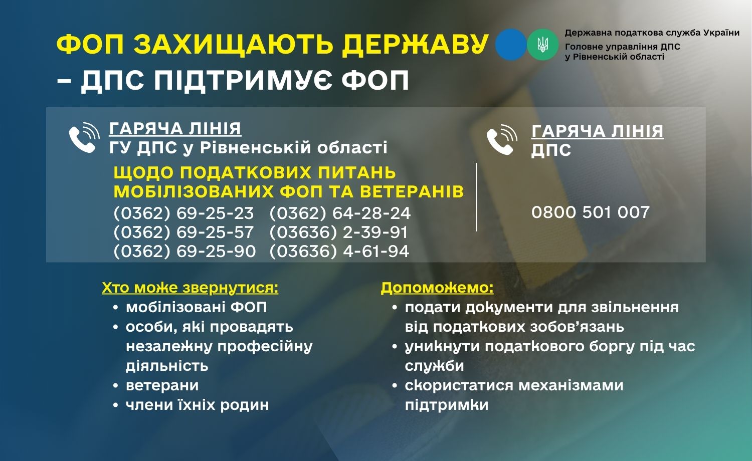 Для вирішення податкових питань мобілізованих самозайнятих осіб в Головному управлінні ДПС у Рівненській області організовано роботу «гарячих ліній», де можна отримати консультації щодо адміністрування податків, звільнення від податкових зобов’язань мобілізованих ФОП та осіб, які провадять незалежну професійну діяльність.