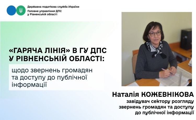 У Головному управлінні ДПС у Рівненській області відбулася «гаряча лінія» на тему: «Звернення громадян та порядок доступу до публічної інформації». На запитання додзвонювачів відповідала завідувач сектору розгляду звернень громадян та доступу до публічної інформації Наталія Кожевнікова.