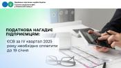 Головне управління ДПС у Рівненській області звертає увагу фізичних осіб – підприємців, що 19 січня 2025 року останній день сплати єдиного внеску ФОП, у тому числі тими, які обрали спрощену систему оподаткування, особами, які провадять незалежну професійну діяльність, та членами фермерського господарства, якщо вони не належать до осіб, які підлягають страхуванню на інших підставах, за IV квартал 2025 року (абзац третій частини восьмої ст. 9 Закону України від 08 липня 2010 року № 2464-VI «Про збір та облік єдиного внеску на загальнообов’язкове державне соціальне страхування»).