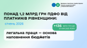 Упродовж січня 2026 року платники податків Рівненщини перерахували до Зведеного бюджету України 1 мільярд 206 мільйонів гривень податку на доходи фізичних осіб (ПДФО).