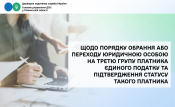 Відповідно до п. 298.1 ст. 298 Податкового кодексу України від 02 грудня 2010 року № 2755-VI зі змінами та доповненнями (далі – ПКУ) визначено, що порядок обрання або переходу на спрощену систему оподаткування платниками єдиного податку, зокрема третьої групи здійснюється відповідно до п.п. 298.1.1 – 298.1.4 ст. 298 ПКУ.