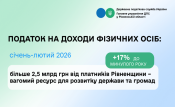 Упродовж січня–лютого 2026 року платники податків Рівненщини спрямували до зведеного бюджету країни 2,5 млрд грн податку на доходи фізичних осіб (ПДФО). Це на 361,4 млн грн більше, ніж за відповідний період 2025 року.