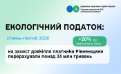 За січень-лютий 2026 року для захисту довкілля суб’єкти господарювання Рівненщини перерахували до зведеного бюджету 33,3 млн гривень екологічного податку. Із цієї суми 24,1 млн грн надійшло до державного бюджету та 9,2 млн грн було зараховано до спеціального фонду місцевого бюджету.
